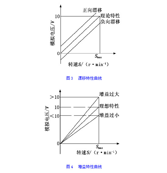 模拟量(liang)輸出的漂移特性(xìng)曲線如圖3所示,調(diào)整漂移參❄️數♍可改(gai)🔞變轉速S0所對應的(de)電壓輸出值,使特(te)性曲👉線上🏒下平移(yi)。本例中漂移參數(shù)設定為0時,實測S0轉(zhuan)速對應電壓為-0.048V,特(tè)性曲線✉️為負向漂(piāo)移曲線。經計算和(he)❤️設定漂移參數後(hou),再次實測漂移電(diàn)壓為-0.002V,基本接近💛于(yu)0V,特性曲線基本接(jiē)近理想特性曲線(xian)。