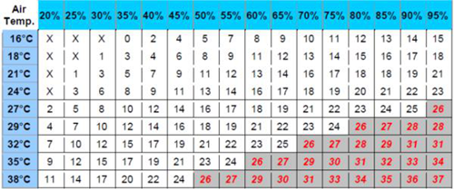 露點表根據(ju)濕度和溫度給出(chu)露點溫度(C),冷卻水(shui)必須高于露點溫(wēn)度以防止結露。